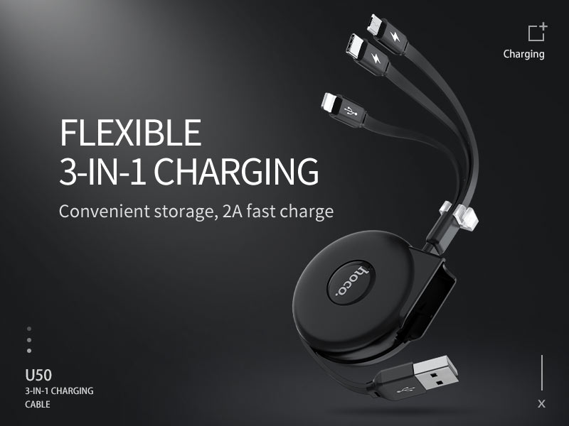 U50 3-in-1 retractable charging cable USB to Lightning / Micro-USB / Type-C total 1m length aluminum alloy joints.
