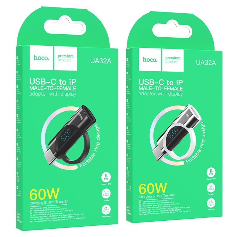 UA32A, portable adapter Type-C male to iP female, digital display, supports 60W charging, OTG and data transfer