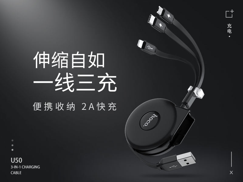 U50 一拖三 双拉充电线 Lightning Micro-USB Type-C